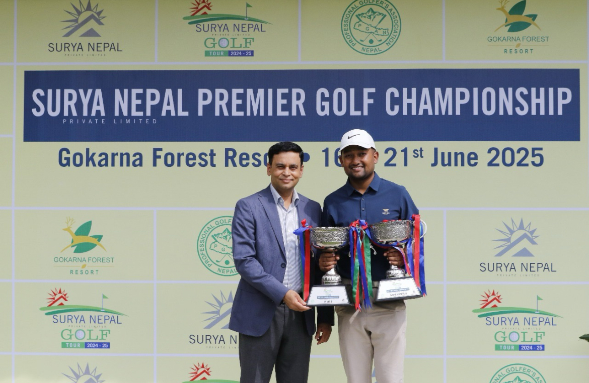 "content": "<p><span style=\"-webkit-tap-highlight-color: rgba(26, 26, 26, 0.3); -webkit-text-size-adjust: auto; caret-color: rgb(0, 0, 0); color: rgb(0, 0, 0); font-family: UICTFontTextStyleBody; font-size: 17px;\">काठमाडौं, असार ५ः एमेच्योर गल्फर राहुल विश्वकर्माले सूर्य नेपाल गल्फ टुर २०२४–२५ को अन्तिम प्रतियोगिता सूर्य नेपाल प्रिमियर गल्फ च्याम्पियनसिपको उपाधि जितेका छन्। समग्रमा २१ अन्डर २ सय ६७ को स्कोरमा नेपाल नम्बर एक प्रोफेसनल गल्फर भुवन नगरकोटीलाई २ स्ट्रोकले हराउँदै करियरकै उपाधि जितेका हुन्। राहुलले आज ५–अन्डर ६७ को स्कोर गरे। </span></p><p><span style=\"-webkit-tap-highlight-color: rgba(26, 26, 26, 0.3); -webkit-text-size-adjust: auto; caret-color: rgb(0, 0, 0); color: rgb(0, 0, 0); font-family: UICTFontTextStyleBody; font-size: 17px;\">राहुलले यो सिजनको दोस्रो उपाधि जिते। यसअघि उनले सिजनको पहिलो प्रतियोगिता सूर्य नेपाल सेन्ट्रल ओपन जितेका थिए। </span></p><p><span style=\"-webkit-tap-highlight-color: rgba(26, 26, 26, 0.3); -webkit-text-size-adjust: auto; caret-color: rgb(0, 0, 0); color: rgb(0, 0, 0); font-family: UICTFontTextStyleBody; font-size: 17px;\">समग्रमा १९–अन्डर २ सय ६९ को स्कोरमा भुवन नगरकोटी दोस्रो भए। उनले आज ८–अन्डर ६४ को स्कोर गरे। प्रोतर्फ पहिलो भएका उनले नगद ३ लाख प्राप्त गरे। एमेच्योर सदभाव आचार्य समग्रमा १८–अन्डर २ सय ७० को स्कोरमा तेस्रो भए। उनले आज ५–अन्डर ६७ को स्कोर बनाए। उनी एमेच्योरतर्फ दोस्रो भए। </span></p><p><span style=\"-webkit-tap-highlight-color: rgba(26, 26, 26, 0.3); -webkit-text-size-adjust: auto; caret-color: rgb(0, 0, 0); color: rgb(0, 0, 0); font-family: UICTFontTextStyleBody; font-size: 17px;\">साबिक विजेता सुबाश तामाङ समग्रमा १५–अन्डर २ सय ७३ सहित चौथो भए। उनले आज इभन–पार ७२ स्कोर गरे। प्रो तर्फ उनी दोस्रो हुँदा नगद १ लाख ८५ हजार प्राप्त गरे। भुटानका एमेच्योर निम दोर्जी तामाङ समग्रमा १४–अन्डर २ सय ७४ सहित पाँचौं स्थानमा रहे। उनले आज ६–अन्डर ६६ को उत्कृष्ट स्कोर गरे। एमेच्योरतर्फ उनी तेस्रो भए। </span></p><p><span style=\"-webkit-tap-highlight-color: rgba(26, 26, 26, 0.3); -webkit-text-size-adjust: auto; caret-color: rgb(0, 0, 0); color: rgb(0, 0, 0); font-family: UICTFontTextStyleBody; font-size: 17px;\">धरानका प्रो निरज तामाङले आज १–ओभर ७३ स्कोर गरे। समग्रमा १०–अन्डर २ सय ७८ सहित छैटौं भए। प्रो तर्फ तेस्रो भएका उनले १ लाख २५ हजार नगद हात पारे। उनी आगामी सिजनको नम्बर एक खेलाडी बनेका छन्। उनले यो सिजन तीन उपाधि सहित सर्वाधिक ८ लाख ६७ हजार ५ सय नगद पुरस्कार प्राप्त गर्दै अर्डर अफ मेरिटमा पहिलो भए।</span><br style=\"-webkit-tap-highlight-color: rgba(26, 26, 26, 0.3); -webkit-text-size-adjust: auto; caret-color: rgb(0, 0, 0); color: rgb(0, 0, 0); font-family: UICTFontTextStyleBody; font-size: 17px;\"><span style=\"-webkit-tap-highlight-color: rgba(26, 26, 26, 0.3); -webkit-text-size-adjust: auto; caret-color: rgb(0, 0, 0); color: rgb(0, 0, 0); font-family: UICTFontTextStyleBody; font-size: 17px;\">दिनेश प्रजापति समग्रमा ९–अन्डर २ सय ७९ को स्कोरमा सातौं भए। उनले आज २–अन्डर ७० स्कोर गरे। प्रो तर्फ चौथो हुँदै नगद १ लाख ५ हजार प्राप्त गरे। शुक्र बहादुर राई समग्रमा ८–अन्डर २ सय ८० सहित आठौं भए। आज ५–अन्डर ६७ स्कोर गरे। प्रो तर्फ पाँचौं भएका उनले नगद ९२ हजार हात पारे। </span></p><p><span style=\"-webkit-tap-highlight-color: rgba(26, 26, 26, 0.3); -webkit-text-size-adjust: auto; caret-color: rgb(0, 0, 0); color: rgb(0, 0, 0); font-family: UICTFontTextStyleBody; font-size: 17px;\">समग्रमा ३–अन्डर २ सय ८५ को स्कोरमा प्रो सञ्जय लाम