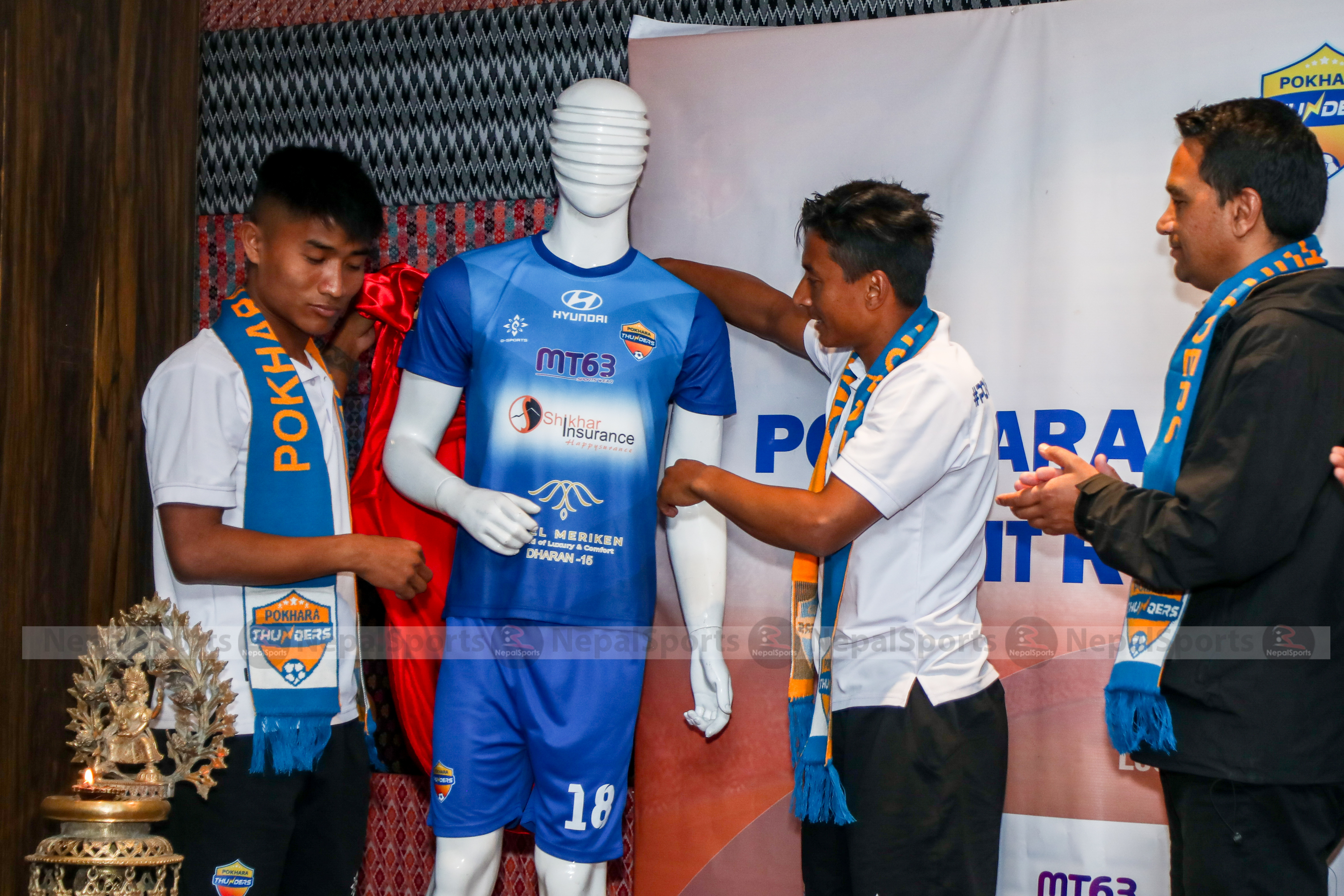 "content": "<p><span style=\"-webkit-text-size-adjust: 100%;\">काठमाडौं । नेपाल सुपर लिग (एनएसएल) को फ्रेन्चाइज टोलीले पोखरा थण्डर्सले तेस्रो संस्करणका लागि जर्सी सार्वजनिक गरेको छ।</span><br></p><p><span style=\"-webkit-text-size-adjust: 100%;\">पोखराले मंगलबार एक कार्यक्रम आयोजना गर्दै क्लबको जर्सी सार्वजनिक गरेको हो।</span><br></p><p><span style=\"-webkit-text-size-adjust: 100%;\">पोखराले निलो, पहेँलो र प्याजी रङ गरि तीन वटा जर्सी सार्वजनिक भएको छ।</span><br></p><p><span style=\"-webkit-text-size-adjust: 100%;\">पोखराका मार्की प्लेयर समीर तामाङ, फरवार्ड नवयुग श्रेष्ठ, क्लबका ब्राण्ड एम्बासडर गायक छेवाङ तामाङ, कीट पार्टनर जी स्पोर्टस प्रमुख अध्यक्ष सुन्दर थापा लगायतले क्लबको जर्सी सार्वजनिक गरे।</span><br></p>",